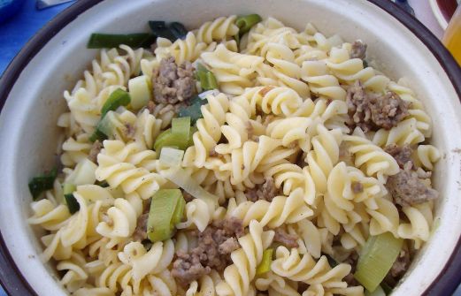 Zutaten: 250g gemischtes Hackfleisch 1x Zwiebel 500g Nudeln 1x Stange Porree 2 EL Öl Salz + Pfeffer Zubereitung: 1. Nudeln nach Anleitung kochen. 2. Zwiebel in kleine Würfel hacken und zusammen mit dem Hackfleisch in etwas Öl anbraten. Mit Salz und Pfeffer würzen. 3. Den Porree gu [...]