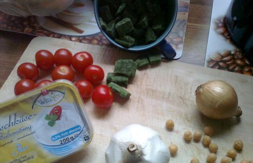 Zutaten: 425 Gr. Kichererbsen (Abtropfgewicht) 250 Gr. Spinat 250 Gr. Kirschtomaten 1 Zwiebel 2 Knoblauchzehen 1 Tl. Öl 100 Gr. Frischkäse (natur, 0,2 % Fett) Ca. 100 Ml Wasser Salz, Pfeffer Basilikum, Petersilie Heute also ein ganz neues Rezept, das ich sicher nicht zum letzten Mal gemacht hab [...]