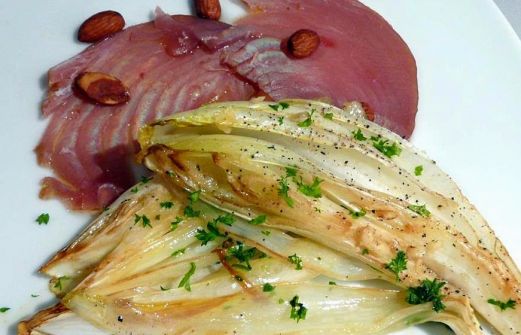 Den Chicorée putzen, waschen und längs halbieren.