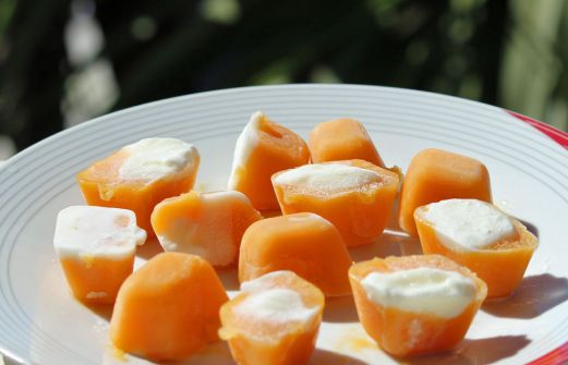Sonntag, Meer, Nichtstun, Seele baumeln lassen... ... und EISKONFEKT ... Yammi Frauchen hat dafür Obst, hier sind es Bananen und Pfirsiche, püriert, einen Klacks Joghurt obendrauf gegeben und alles eingefroren.