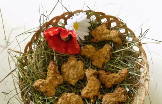 500 g Hackfleisch 1 Glas Babybrei Karotte-Kartoffeln 1 Ei 3 EL feine Haferflocken 3 EL grobe Haferflocken 6 EL Kartoffelmehl alles gut mischen und und eventuell noch etwas Kartoffelmehl zugeben. Den Teig ausrollen und kleine Rauten vorschneiden (man kann dann später die Teilch [...]
