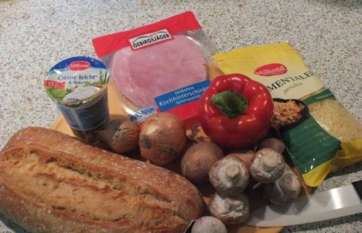Zutaten (4 Personen): 1 Ciabatta Brot 1 mittelgroße Zwiebel 1 Paprika (rot oder gelb) 1 Hand voll Champignons 1 Becher Creme Fraiche mit Kräutern 1/2 Tüte Raspelkäse 200g gekochter Schinken 1 Knoblauch-Zehe Zubereitung: Paprika, Zwiebel, Champignons, Knoblauch und gekoc [...]