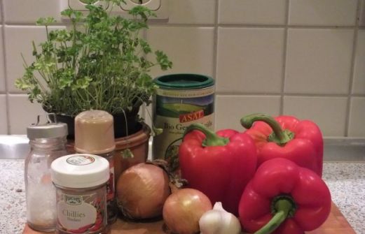 Zutaten ( 2 Personen): 3 rote Paprika (dürfen auch gelbe oder grüne sein) 2 kleine Zwiebeln 1 Knoblauchzehe 600 ml Gemüsebrühe 1/2 TL Chiliflocken 1 EL gehackte Petersilie Salz Pfeffer 1 EL Olivenöl Wer mag kann auch aufpeppen mit: 100 ml Prosecco 100 ml Sahne Die Menge an Brüh [...]