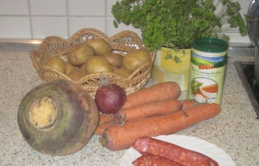 Zutaten (4 Personen): 1 Steckrübe (auch bekannt als Kohlrübe) 6 mittelgroße Karotten 6 mittelgroße Kartoffeln 2 Zwiebeln 1,5 l Gemüsebrühe 4 Mettenden 1/2 TL Kümmel 1 Bund Petersilie Pfeffer ggf. Salz zum Nachwürzen bei Bedarf 1 EL Rapsöl zum Braten Zubereitung: Karotten, Kart [...]