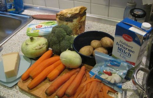 Zutaten (für 2 Personen als Hauptgericht, für 4 Personen als Beilage): 8 Karotten 1 großer Kohlrabi 1 Strunk Brokkoli 4 gekochte Pellkartoffeln vom Vortag 125 ml Milch 125 ml von dem Gemüsekochwasser 2 EL Mehl 1 EL Margarine 1 Kugel Mozarella 30 g Parmesankäse Salz, Pfeffer [...]