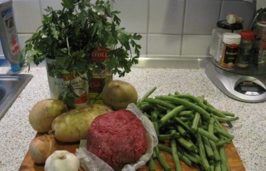 Zutaten (für 2 sehr hungrige Personen): 500 g Buschbohnen 2-3 große Kartoffeln 300 g Beefsteakhack (Wahlweise gemischtes Hack) 1 Bund glatte Petersilie 1 Zwiebel 1 Knoblauch Zehe Gemüsebrühe (instant) 1 TL Olivenöl Salz Pfeffer Chiliflocken Zubereitung: Die Bohnen waschen und pu [...]