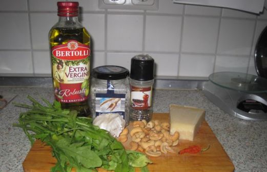 Zutaten (4 Personen): 350 - 400g trockene Linguine (oder Spaghetti, oder so) 2 Bund Rucola 70g Cashew Nüsse 60g Parmesan 1 Knoblauch Zehe Olivenöl Salz Pfeffer 1 kleine Chili Zubereitung: Die Nudeln nebenbei schon mal kochen. Rucola gründlich waschen und klein hacken. [...]