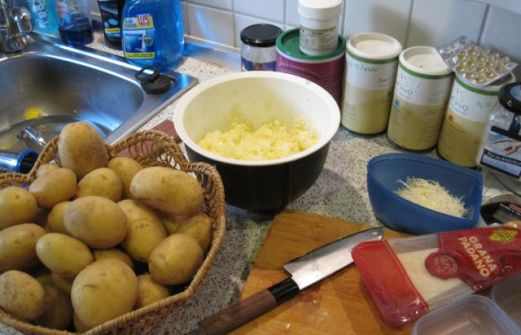Die Kartoffeln schälen, Zwiebel pellen und würfeln, Knoblauch pellen und würfeln.