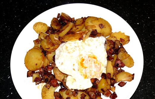 mein Rezept: Zutaten für eine Person: 3 geschälte Pellkartoffeln, 100 g durchwachsenen Speck, 1 Zwiebel, Salz nach Geschmack, Zubereitung: Den durchwachsenen Speck in mittelgroße Würfel schneiden, die Zwiebel schälen und grob würfeln. In einer großen Pfanne m [...]