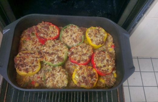 Zutaten 2 rote Paprikaschoten 2 gelbe Paprikaschoten 2 grüne Paprikaschoten 1 große Zwiebel 2 Beutel Langkornreis Salz 2 Bund Lauchzwiebeln 1 EL Öl 1kg gemischtes Hackfleisch Pfeffer 150g Ketchup 250 ml Gemüsebrühe 2 EL Tomatenmark Zubereitung Paprika waschen, Deckel abschne [...]