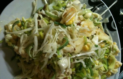 1 halber Kohlkopf 3 Äpfel 400 gr. Räuchertofu 3 Stangen Lauch 1 kleine Dose Mais die doppelte Menge Sojanaise nach diesem Rezept etwas geriebener No Muh Dezent Weißkohl als erste Schicht in eine große Schüssel reiben. Darüber eine Schicht aus geriebenem Apfel geben. Als näch [...]