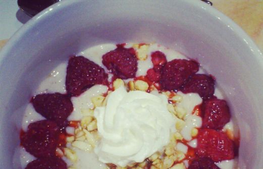 2 Portionen 500ml Magermilch Mark einer Vanilleschote Vanillearoma* Süssstoff (oder anderer Zuckeraustauschstoff) 1-2 TL Johannisbrotkernmehl** 3EL Nüsse nach Wahl, kleingehackt und in der Pfanne geröstet Himbeeren Milch, Vanilleschote, Süssstoff und Johannisbrotkernmehl in ei [...]