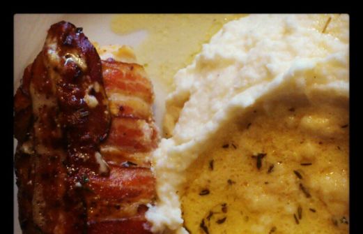 Pouletbrust einschneiden und flach klopfen. Würzen. Mit einem Stück Käse belegen, einrollen und mit Speck umwickeln.