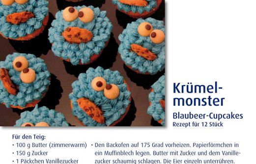 Krümelmonster… :-) Sorte: Blaubeer-Cupcakes Topping: Butter-Frischkäse-Creme, mit blauer Leben smittelfarbe Dekoration: Augen: Marzipan und Schokotröpfchen Mund: Kleiner Cookie Ausführliches Rezept könnt ihr ja oben finden Viel Spaß beim backen… der Hit auf jeder Kinderp [...]