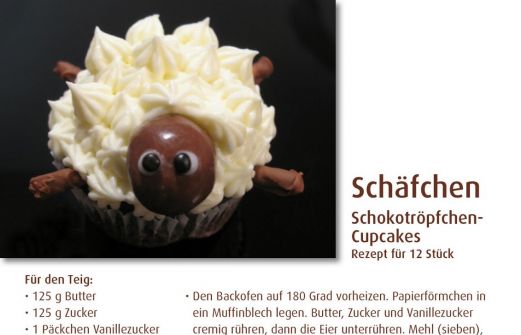 Ein kleines Cupcake-Schäfchen was einem süß entgegen schaut… :-) Sorte: Schokotröpfchen-Cupcakes Topping: Butter-Frischkäse-Creme Dekoration: Kopf: Kleine Nuss, überzogen mit Schokolade Augen: Puderzuckerguss und kleine Schokolinse Beine: Mikado - Stäbchen [...]