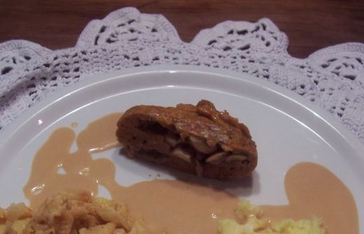 Seitanrollbraten - 200g Glutenmehl, dazu 1 Eßl. Paprika, 1 Eßl. Curry, 1 Teel. Salz, 1 Teel. Senf, 300 ml Wasser alles zusammen vermengen zu einem Teig und diesen ausrollen. Pilzmasse in der Pfann zubereiten ,it Zwiebeln, Knoblauch, Champignons, zum Andicken habe ich Mandelmus verwendet. [...]
