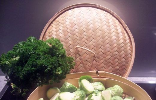 Zunächst mal den Rosenkohl vorgaren im Bambusdämpfer
