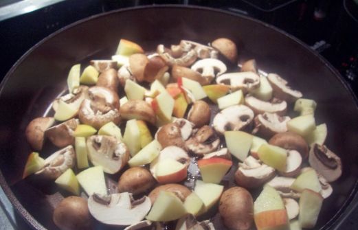 halbe Champignons mit Äpfeln in Rapsöl anbraten. etwas salzen, Ordentlich satt Agavendicksaft dazu und karamelisieren lassen, dann zum Schluss halbe Walnüsse dazugeben, eventuell mit etwas Apfelsaft ablöschen Zum Schluss noch ein paar rohe Porreestreifen dazugeben. Bitte nicht mehr zu lang [...]