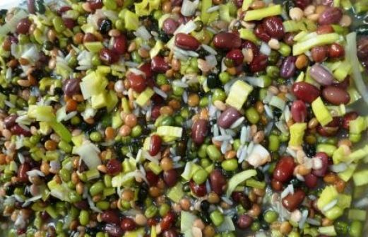 Hier im eingeweichten Rohzustand zu sehen, mit Mungobohnen, Azukibohnen, Uridbohnen, roten Linsen, Berglinsen, Belugalinsen, ausserdem Lauch und Zwiebeln: