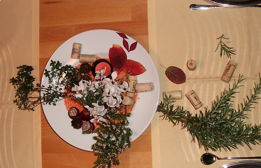 Eine weiße Schale, bepflanzt mit einem weißen Alpenveilchen, Erika, Thymian und Rosmarin. Blätter und Weinkorken.