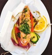 1 Portion 1 großes Stück Pergamentpapier/ Backpapier 1 TL Olivenöl = 1.0 200 g Hähnchenbrustfilet= 5.0 1 Zucchini, in Längsstreifen geschnitten 1 Möhre, in Längsstreifen mit dem Sparschäler geschnitten 4 Champignons, in Scheiben 1/2 Paprika, in Längsstreifen mit dem Sparschäler geschnitten [...]