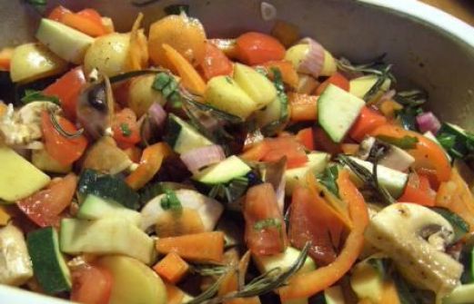 Für 2 große Teller 3 Schalotten 2 Knoblauchzehen 1 große Möhre 1 mittlere Zucchini 10 kleine Kartoffeln mit Schale (Drillinge) = 7.0 "satt" 5 mittlere Champignons 3 Tomaten 1 großen Zweig Rosmarin, frisch und entnadelt 1/2 Hand voll frischem Basilikum 2 EL Olivenöl = 6.0 1 EL Balsamico sch [...]