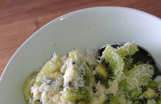 Zutaten 5 Kiwis 30 gr gepufften Amaranth 125 gr Sojajoghurt Kokosraspeln Argavendicksaft Zubereitung Amarant mit Sojajoghurt vermischen, kurz ziehen lassen. In der Zeit die Kiwis schälen und schneiden. Kiwis über den Amarant-Joghurt geben, mit Argavendicksaft beträufen und Kokosraspeln [...]