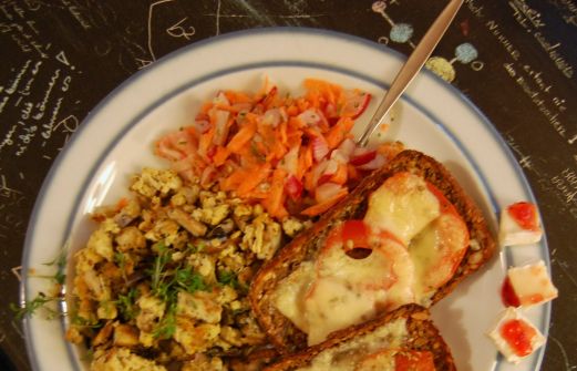 lowcarb,lowcarb,lowcarb... Das hier ist ein beispielhaftes Abendessen bei mir. Man sieht einen Karotten-Radieschen-Salat Rührei mit Champignons und Basilikumtofu Eiweißtoastbrötchen; erst getoastet, dann mit Tomate, Oregano und Käse im Miniofen überbacken ein bisschen Ca [...]