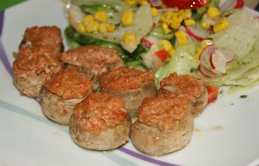 Zutaten: 250g Champignons 50g Sonnenblumenkerne 1 Tomate 1 EL Tomatenmark 1 Knoblauchzehe Salz Pfeffer etwas Olivenöl Die Champignons waschen und die Stiele entfernen. Die Sonnenblumenkerne mit etwas Wasser, Tomatenmark, der Tomate, der Knoblauchzehe, S [...]