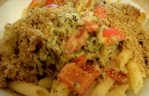 Die Zuchini kleinraspeln, die Tomaten würfeln und in etwas Olivenöl andünsten. Die Sojasahne sowie die Gewürze dazugeben und einige Minuten köcheln lassen.