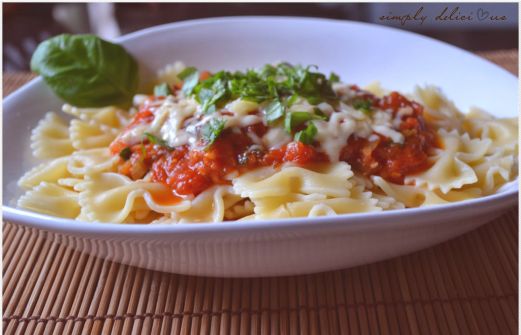 Heute hatte ich so lust auf Pasta! Also gab es Farfalle mit einer Tomaten Soße die ich frei erfunden habe. Mal etwas ohne Fleisch. Es hat uns sehr gut geschmeckt. Und ich werde es aufjedenfall wieder nachkochen. Die Pastawahl ist eigentlich egal :) Viel spaß beim nachmachen!