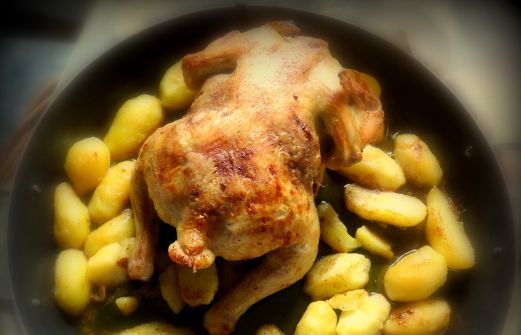 Rezept.Hierbei bleibt das Haehnchen im Ganzen und die Kartoffeln werden vorgekocht.