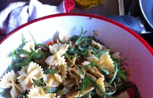 500 g Nudeln 200 g Cocktailtomaten 1 Bund Rucola 1 Glas Tomate(n), getrocknete, in Öl 1 kl. Glas Oliven 1 Beutel Pinienkerne 50 g Parmesan Für die Sauce: 1 Teil/e Olivenöl 2 Teil/e Öl von den Tomaten 1 Teil/e Aceto balsamico etwas Senf oder Ketchup 1 Zwiebel(n), fein gehackt 1 Knoblauchzehe(n), [...]