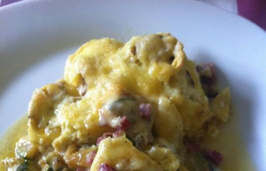 250g Tortellini 2 Knoblauchzehen 2 EL Butter 1 Zucchini Salz, Pfeffer, Oregano 75g durchwachsenen Speck 150g Gouda 3 Eier 1/2 Becher Sahne oder Milch Die Tortellini nach Anweisung garen. Inzwischen die geschälten und durch die Presse gedrückten Knoblauchzehen in der Butter andünsten. Zucchini w [...]