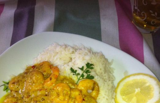 250 g Garnele(n) (Riesengarnelen) ½ Zwiebel(n) 1 Zehe/n Knoblauch 1 Chilischote(n), rot oder grün 1 EL Öl (Erdnußöl) ½ TL Ingwer, gerieben ½ TL Kurkuma ½ TL Curry 125 ml Kokosmilch Salz ½ Zitrone(n) in Scheiben geschnitten Die Garnelen waschen und aus den Schalen lösen. [...]