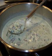 250g rohe Speckwürfel 500g Thüringer Mett 2 Zwiebeln 4 Stangen Porree 2 Dosen passierte Tomaten mit Stücke 150g Champignons 1 Dose Mais 1 Brühwürfel 1/2 Liter Wasser 300g Kräuterschmelzkäse 1 Becher Sahne gehackte Petersilie Salz und Pfeffer Speckwürfel in einem großen Topf scharf anbraten. Met [...]