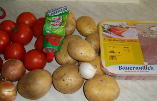 500 g Putenfleisch 2 mittlere Zweibeln 500 - 600 g Kartoffeln 2 kleine Dosen Tomatenstücke oder 500 g frische Tomaten ( ich bevorzuge kleine ,die sind geschmackvoller ) plus Tomatenmark Öl , Salz & Pfeffer & Rosmarin Öl in der Pfanne ( oder im Topf ) erhitzen. Das Fleisch in mundgerecht [...]