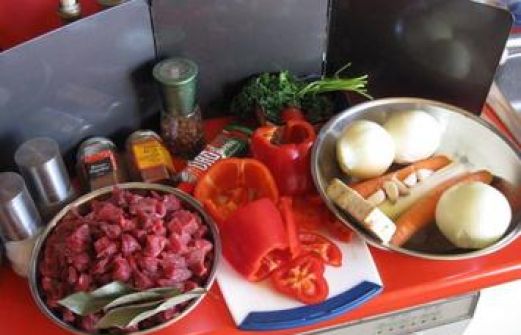 Zutaten für Personen Rezept mit Bild: Gulaschsuppe Bild einstellen 1 ½ Kilogramm Rindergulasch 3 Gemüsezwiebel frisch 3 Paprika rot 5 Knoblauchzehen 1 Bund Suppengrün frisch 6 Kartoffel [...]