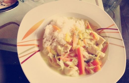300g in streifen geschnittenes Hähnchenbrustfilet 2 sehr fein gehackte Schalotten 1 dicke Stange Lauch 1 Knoblauchzehe - sehr fein gehackt 1 große Möhre in streifen oder gewürfelt 1 rote oder gelbe Paprika - gewürfelt 1 Esslöffel Sesamöl 750ml Gemüsebrühe 250ml Kokosmilch etwa [...]