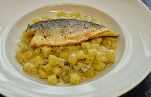 4 Personen 1 kg Kartoffeln 1 große Zwiebel 250 ml Gemüsebrühe 200 g Gewürzgurken ( Glas ) 4 Wolfsbarsch Filets mit Haut Butterschmalz 1 Becher Creme fraiche Dill frisch Salz und Pfeffer. Mehl Kartoffeln schälen und in Würfel schneiden .Zwi [...]