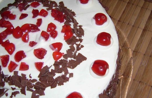 Zutaten für den Teig: 7 Eier 210 g Zucker 1 P. Vanillezucker 140 g Mehl 40 g Kakao 1 TL Backpulver 1 EL Kirschwasser Weitere Zutaten: 2 Gläser Sauerkirschen 4 B. Sahne 4 P. Vanillezucker 4 P. Sahnesteif 3/4-1 Glas Sauerkirschkonfitüre Schokoraspel Kirschwasser Belegkirschen Zubereitung: Eier tr [...]