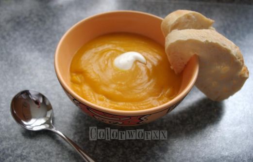 Der Kürbis, genauer gesagt der Hokkaido, wurde gestern erfolgreich verarbeitet und zwar zu einer leckeren Suppe und so sieht sie aus: