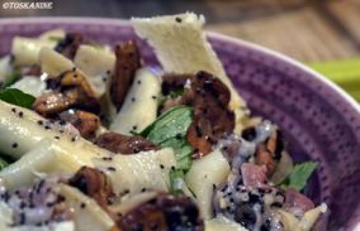 Zutaten für Personen Rezept mit Bild: Bandnudelsalat mit Pfifferlingen und Mohn Bild einstellen Bandnudeln 200 g Pastamehl 1 Ei 1 Prise Salz Wasser Reismehl Sonst 100 g P [...]