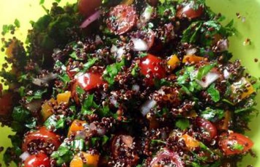 Zutaten für Personen Rezept mit Bild: Tabouleh mit schwarzem Quinoa Bild einstellen 150 Gramm Quinoa schwarz 40 Gramm Petersilie glatt gehackt 250 Gramm Cherry Dattel Tomaten 1 Zwiebel rot, gewürfelt [...]