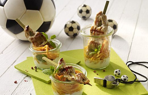 für 4 Personen 600 g Süßkartoffeln 1/2 Bund Pfefferminze 1 TL Zucker 1 EL Weißweinessig 2-3 TL Pflanzenöl 1 Prise gemahlener Zimt Salz und Pfeffer aus der Mühle 200 g Joghurt Saft von 1 Zitrone 600 g Putenbrust 8 Stk Holzspieße 1/2 TL Cayenne-Pfeffer 1 EL roter Pfeffer Öl zum Braten [...]