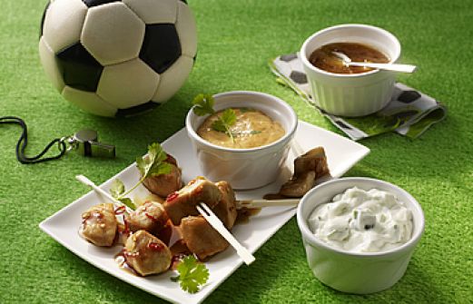für 4 Personen Gurkendip: 1/2 Stk Gurke 250 g Sahne Pfeffer Paprika-Mayonnaise: 100 g Paprika creme aus dem Glas (Ajvar) 200 g Mayonnaise Mango-Aprikosenchutney: 75 g Softaprikosen 250 g Mango -Chutney aus dem Glas Für die scharfen Hähnchenwürfel: 2-3 kleine Chilischoten Abrieb und Saf [...]