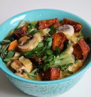 Nudeln mit Tofu und Pak Choi Zutaten 500 g Tofu 4 EL helle Sojasauce 1 EL grüne Thai-Currypaste 4 Knoblauchzehen 50 g Ingwer 600 g Baby-Pak-Choi (ersatzweise Mangold) 200 g breite Reisnudeln 1 ½ EL süße Sojasauce 2 EL Öl 1 TL geröstetes Sesamöl 2 EL geröstete, gesalzene Erd [...]