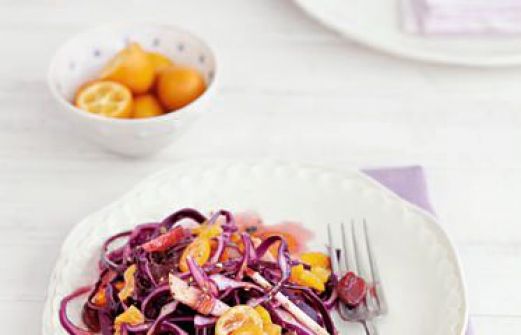 Salat mit Aprikosen-Cranberry-Dressing Zutaten 5 getrocknete Aprikosen 150 ml Apfelsaft 4 Nelken 1 Zimtstange 1 Sternanis 50 g getrocknete Cranberries 1 EL Aprikosenkonfitüre (ohne Stücke) 1 TL Dijon-Senf 3 EL Rotweinessig 4 EL Sonnenblumenöl Salz Pfeffer ½ Rotkohl (c [...]