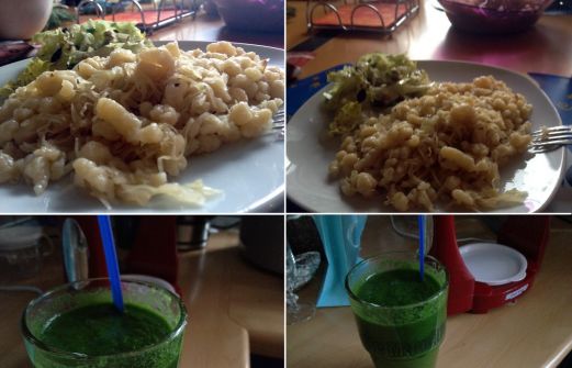 Fangen wir mal mit dem Essen heute an, Mittags gabs Krautspätzle, dazu Salat mit verschiedenen Nüssen. Später hab ich mir dann noch nen grünen Smoothie aus Spinat, Apfel, Kiwi und ner Dattel gemacht und Abends dann wieder Reste vom Mittag ;)