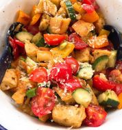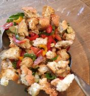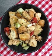 Zutaten für Personen Bild einstellen 300 g altbackenes Fladenbrot 3 Knoblauchzehen gehackt 4 EL Olivenöl 250 g Cocktailtomaten 2 rote Zwiebeln 1 rote Paprikaschote 500 g Salatgurke 1 Bund glatte Petersilie 15 entsteinte O [...]